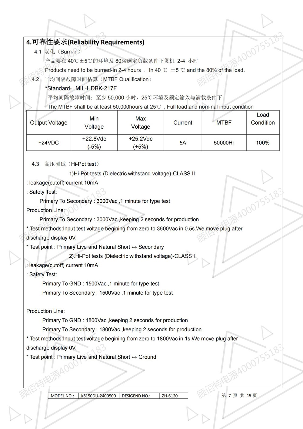 24V5A電源適配器規格書資料詳細描述了一款120W(連續輸出功率)開關電源的電氣性,結構性及環境等要求。
